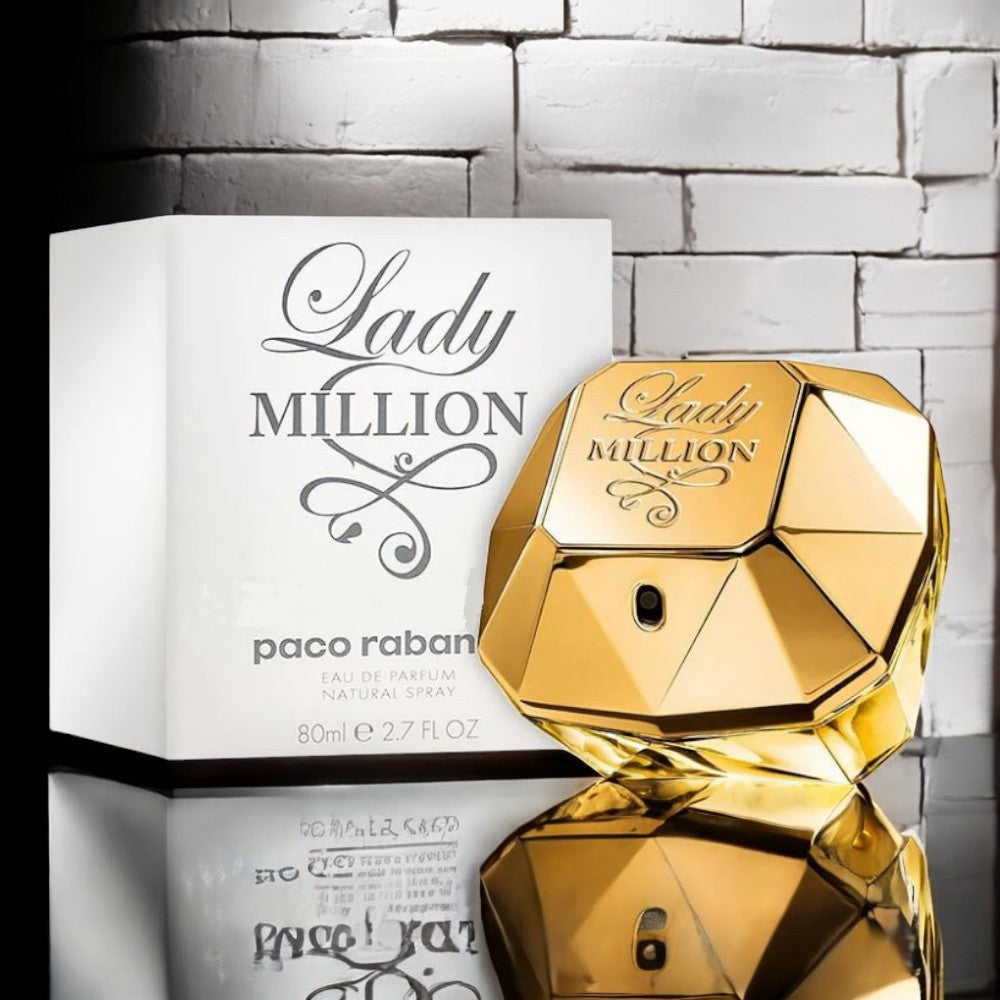 In questa nuova fragranza ritroviamo l'oro, a ricordare 1 Million ma anche la collezione di abiti dorati del designer. Il flacone dal grande impatto visivo passa dalla forza del lingotto d'oro alla brillantezza del diamante. Femminile, giocosa e audace, la donna Lady Million si evolve in un mondo di giochi di seduzione, sogni e fantasie. Presentato come floreale e legnoso, il profumo Lady Million si apre con una nota fruttata di arancia amara ornata di lampone. Nel cuore, la fragranza è floreale e dolce in un connubio di gelsomino e fiori d'arancio. Il fondo legnoso è scaldato da un goloso tocco di miele.